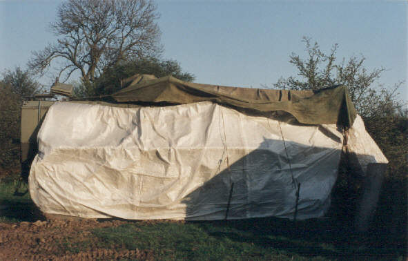 When we first got Sarry going it didn't go very well. After some investigating we found it was number 8 exhaust valve which was not closing fully. So that we could work in the rain and dark we put up a bit of a tent (one of the many tents we put up when working. Note the engine covers (we call them chimney pots [dont ask!]) on the roof.