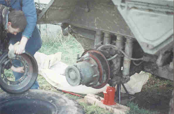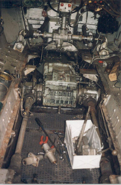 These are trivial compared to the BIG problem we had with the transfer box. After removing the seats out the back, lifting the floor, draining the tank and lifting that out the way. You find that the steering gear has to be taken out !! Simply unbolt the gear box from the engine and pull back. The gear box and transfer box go back 2 inches. Theres still the problem of the one inch still in the fly wheel :-( In the end we took the engine out (found all the lost spanners that we'd dropped) and striped the inside completely and resprayed and/or serviced the lot. Well, may as well 'cos we're now 4 months behind.