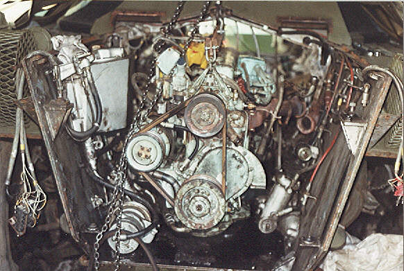 To split the engine from the gearbox, the engine has to be moved forward. This is because the bar from the gear change pedal goes between the bell housing and the gear box allowing only 1 1/2 inches of movement backwards. You need about 2 1/2 to get the splines out of the fly wheel.. Here the engine is shown ready for removal.