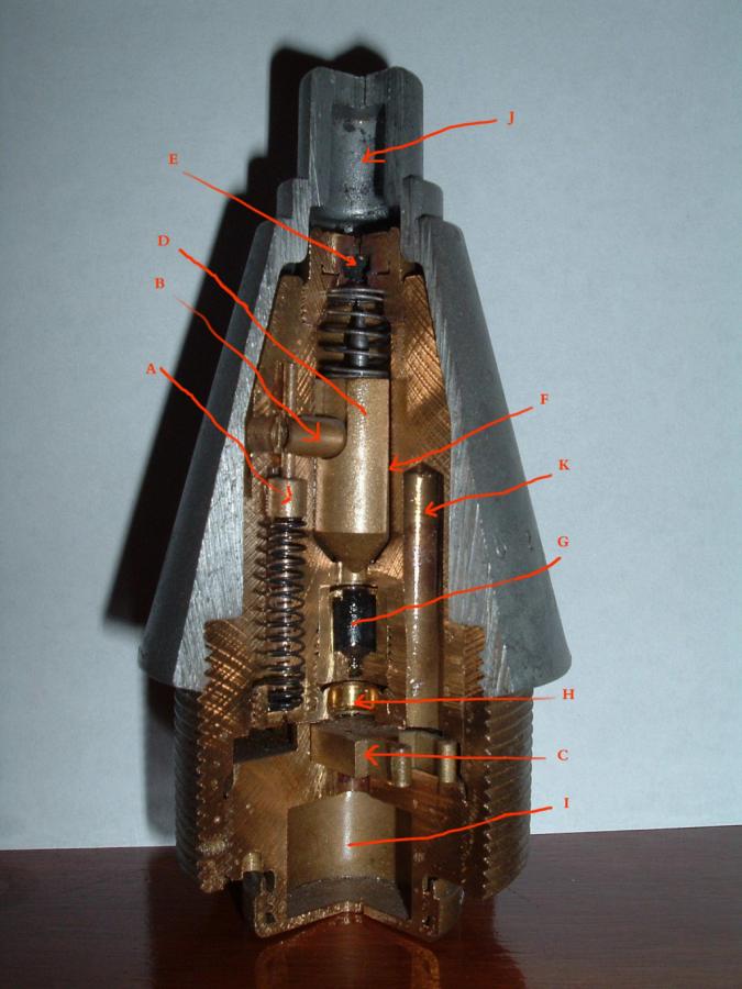 C) Is the last safety, it is also a rotation activated safety, this is a shutter type safety and it moves (to the left rear in this cut away) in its slot and is held there against a spring by the continued spin of the round. The spring is located directly behind it and is not visible in this picture. Should the round not be spinning, it will return to its resting position as shown here. Drilled from the bottom upwards is a small hole in the shutter. This hole does break through the top of the shutter, thus a thin remnant of brass remains. This hole is not in alignment with magazine (H) unless the shutter is held against its spring by rotation of the round.