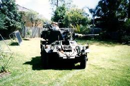My first and still a desire, was a Sherman tank, but this proved hard to obtain so at 19 years old I purchased a 1944 ford jeep. Eventually that was gone so I looked at small tracked vehicles and almost purchased a Scorpion from a museum in 1989 but my wife convinced me we had no room nor could we afford the transport. This just made me desire a turreted vehicle that I could drive on the road. In 1991 I tracked down and saw an immaculate collection and a British Saladin. I was so excited that this vehicle had been created for me I had to get one, there was another which was in poor condition, only driving on its middle wheels, I felt sorry for it and wanted to make it better but the price was too high and it was in Victoria and I lived in QLD. I kept my eyes on it and eventually after moving back to Sydney I visited vehicle owners and one day there was my Saladin at Bob's backyard, he told me who the owner was and I became the proud owner in 3 days. My wife hated it from that day to this. That was in February 1998 and its first big outing came in March at the 50th anniversary of Reserve Forces in Australia. I noted here that it needed more than 2 wheels to drive it. So I paid to have it transported back to Bob's place where he got the front wheels to drive also.