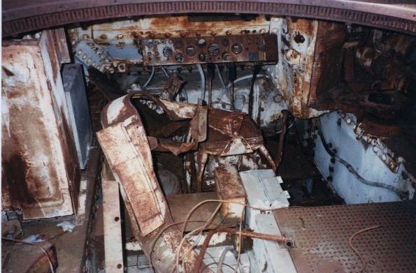 Interior view of the twin GM Grant. You can just make out the drivers position at the front. He straddles the transmission much like you would sit on a horse. The large instrument panel with the remains of all the instruments and controls for the 2 engines is visible.