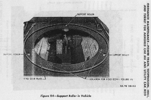 The greyound used virtually the same turret mounting system as the M3/M5 series Light tanks: no turret bearing ring at all. Instead 3 taper face bearings were used which bore on an equivalent taper machined onto the lower side of the turret. There are 8 hold down/centering roller/clamps fitted internally on the Greyhound and externally on the M3/M5 which serve to retain the turret. I have found that with these removed the turret very quickly runs off centre when turned until it falls off 1 or 2 of the support rollers all together.