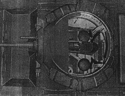 Not a very good original has resulted in a very dark and not very sharp view. You can make out the 2 support leg directly to the right of the seats that form 2/3 of the turret basket (such as there is), the other leg attaches just beneath the gun mount.
